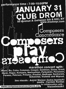 For the record, the composers appearing at Drom on Jan 31st are: Roger Blanc, Thomas Bo, Luis Andrei Cobo, Charles Coleman, Dan Cooper, Larry Goldman, David Gotay, Patrick Grant, Franz Hackl, Don Hagar, Arthur Kampela, Alon Nechushtan, Daniel Palkowski, Milica Paranosic, Akmal Parwez, Joseph Pehrson, Gene Pritsker, Paola Prestini, Jody Redhage, Kamala Sankaram, William Schimmel, Andrew Violette, and Theodore Wiprud.