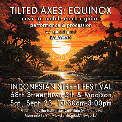 Taking New Music Out Into The World — The 12th season of Tilted Axes is made possible in part by the New York State Council on the Arts (NYSCA) with the support of the Governor and the New York State Legislature, the ASCAP Plus+ Awards, the NYU Tisch School of the Arts Adjunct Development Fund, but mostly through the generous support of you the public through our fiscal sponsor Fractured Atlas.