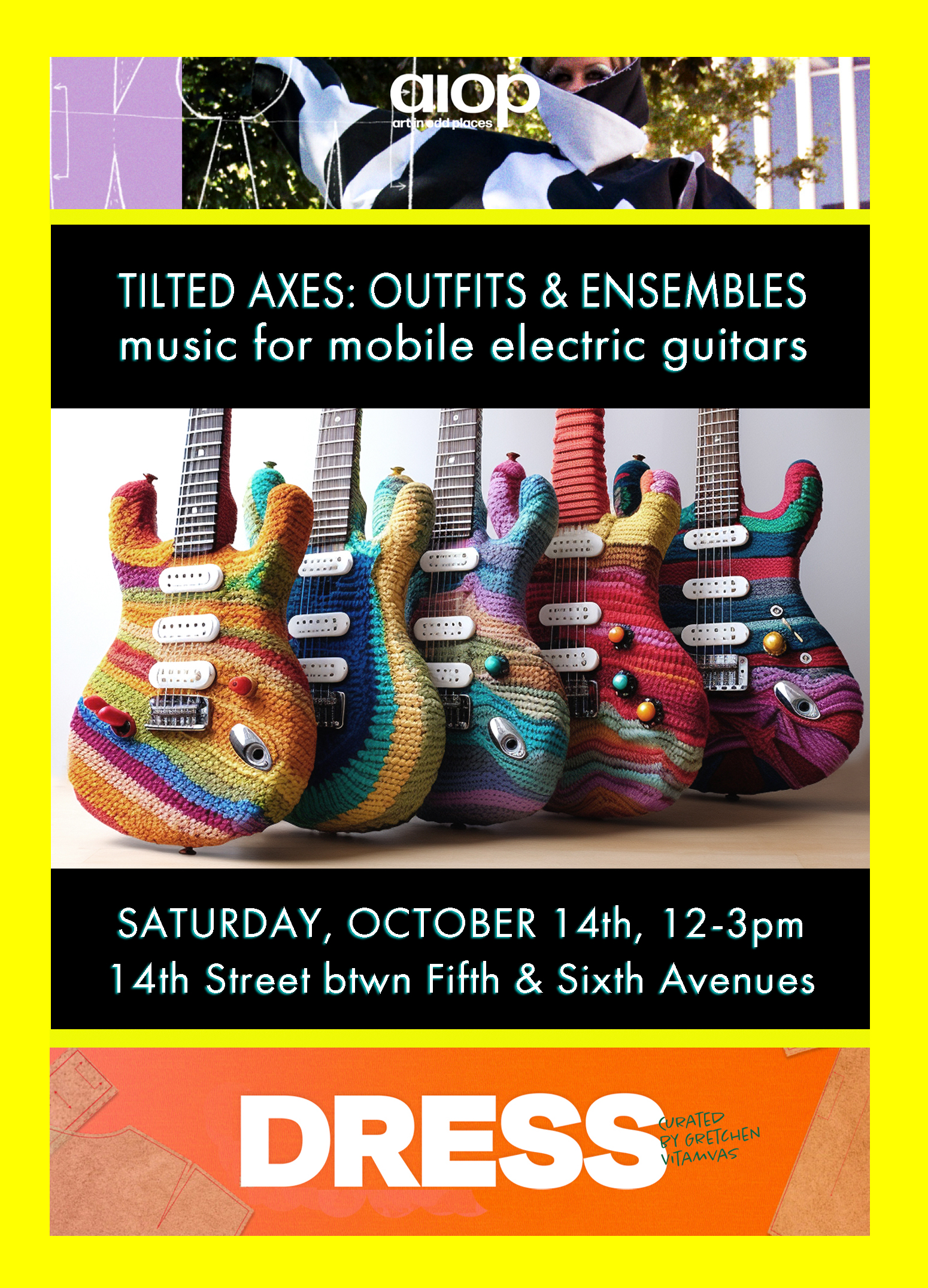 TILTED AXES: Music for Mobile Electric Guitars is an ensemble created and led by composer Patrick Grant.The project takes on aspects of spectacle informed by the tradition of urban street bands, avant-garde theater, and ancient music. It takes music out into the world and seeks transformative situations meant to change the conversation.