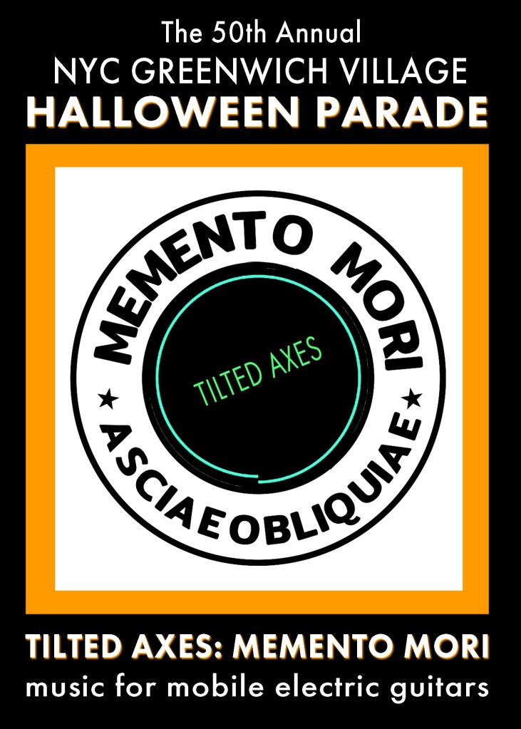 TILTED AXES: MEMENTO MORI — Electric Guitars: Gene Ardor, Angela Babin, Ben Bray, Jessica Dankowitz, Ryan Due, Michael Fisher, Patrick Grant (director), John Halo, Liz Hogg, Jim Lee, Kyle Miller, Anthony Mullin, Dmitri Shapira, Jeremy Slater, Monica Smith, Keith Steimel, Kammy Yedor — Electric Bass: Al Messina, Jeremy Nesse, Kevin Pfeiffer, Sarah Metivier Schadt — Accordion: Dean Olsher — Saxophone: George Monteleone — Violin: Karina Byakova — Percussion: John Ferrari, Roxan Jurkevich, Alec Miniero, Bileshia Sproling — Satellites: Faye Bellucci, Asya Gribov, Proinsias Hederman, Jaidev Nesse — Standard Bearers: Howie Kenty, Alex Lahoski — Choreography: Christopher Caines — Media Producer: Jocelyn Gonzales … and others TBA