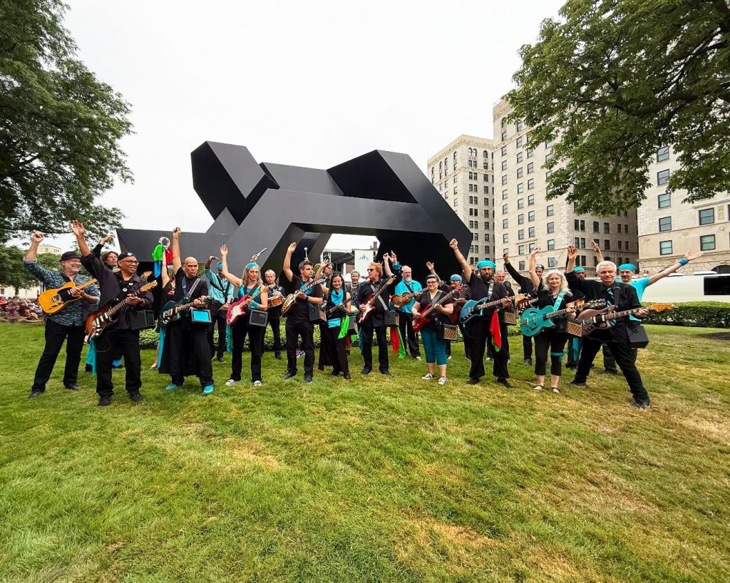 On Saturday and Sunday, July 19 & 20, Tilted Axes: Music for Mobile Electric Guitars took the North Lawn of the Detroit Institute of Arts at around 7:30 pm for their Detroit premiere. The following day at 6 pm, they returned as part of a second procession. Both performances were part of the festival’s free outdoor lineup.