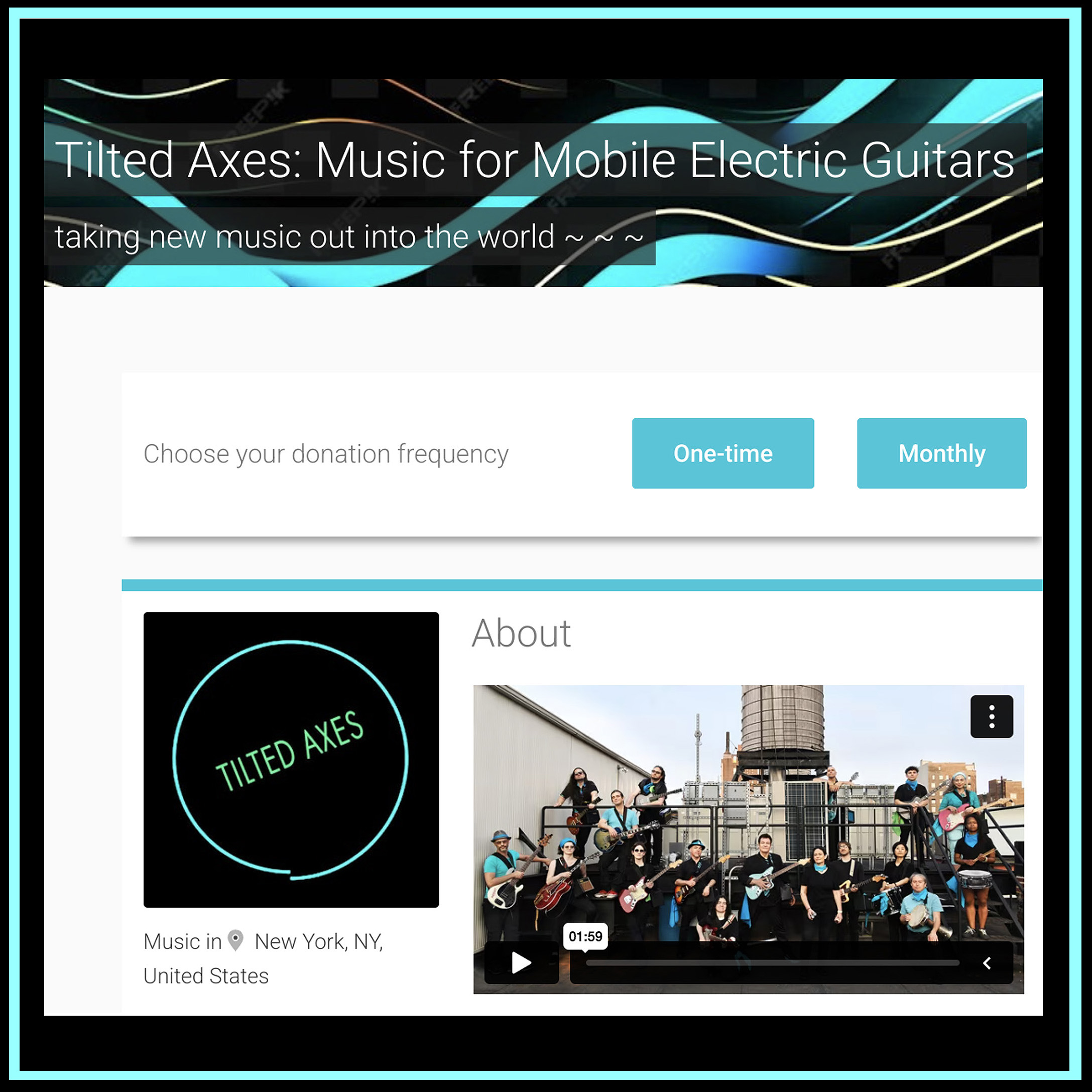 Tilted Axes: Music for Mobile Electric Guitars is a project of Peppergreen Media andis powered by Vox Amplification courtesy of KORG USA. We thank our performance partners Theater for the New City, Make Music New York, Strange Music Inc., and Funkadelic Studios.