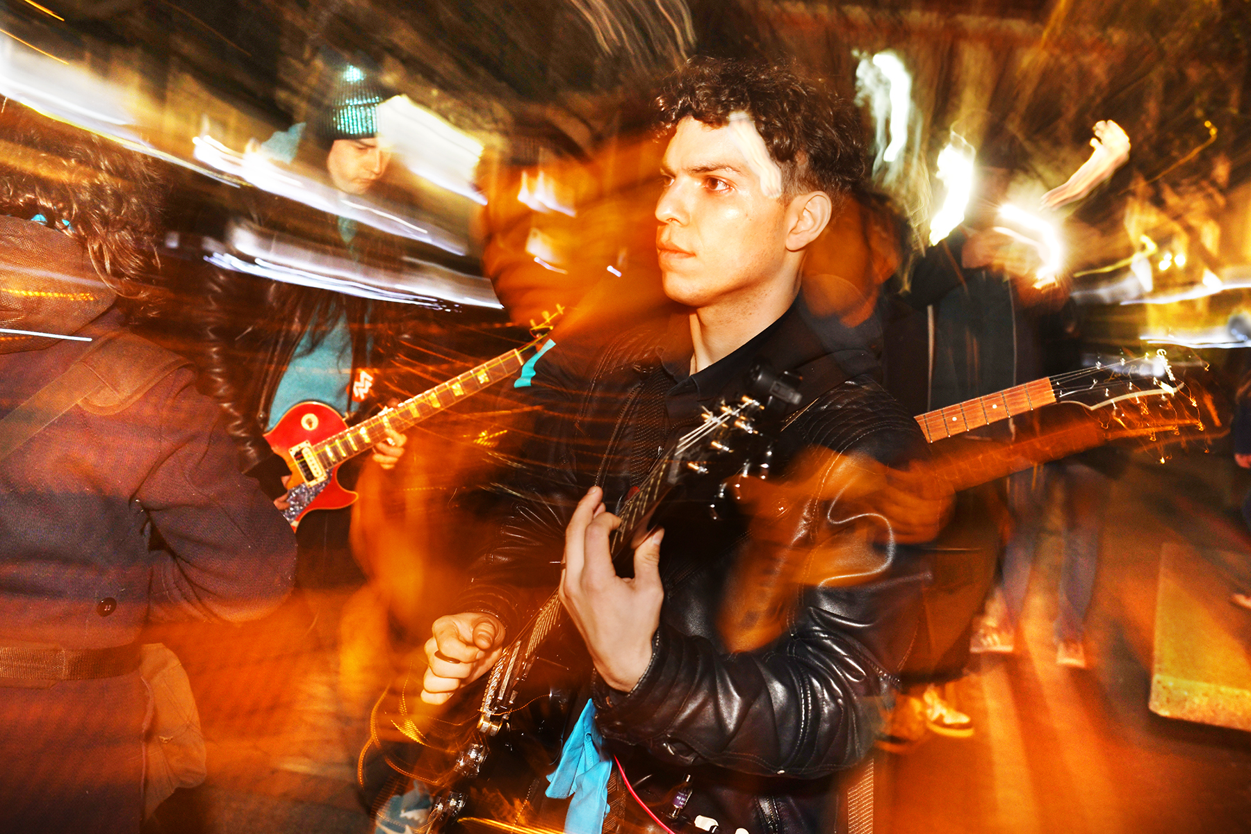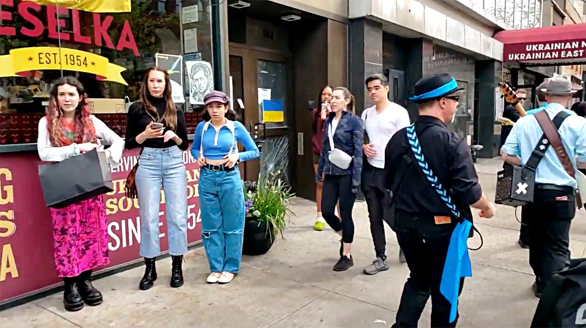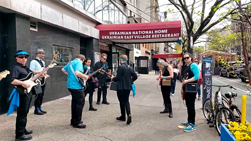 #TiltedAxes performs Elisa Corona Aguilar‘s piece “Invasive Species” outside Veselka :: Beceлкa and the Ukrainian National Center in NYC on May 1st. A choir of electric guitar EBows filled up 2nd Ave. with tones of healing and reflection. The city stopped for a moment. Incredible.