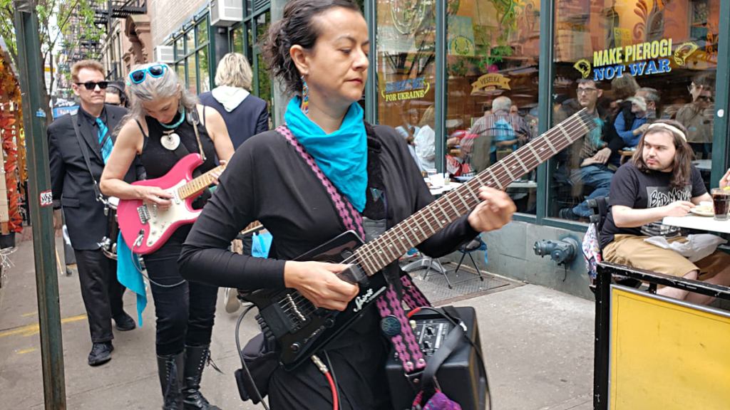 Tilted Axes: Tilt Quintet performs for Open Streets L.E.S. on Avenue B, NYC on July 23, 2022. This was probably their “hottest” show ever with a city-wide heat index of 105 F. It didn’t matter. It was a great show. Electric Guitars: Angela Babin, Howie Kenty, John Halo — Electric Bass: Jeremy Nesse — Percussion: Patrick Grant. Photos: Bob Krasner @bobkrasner @bobkrasnertoo