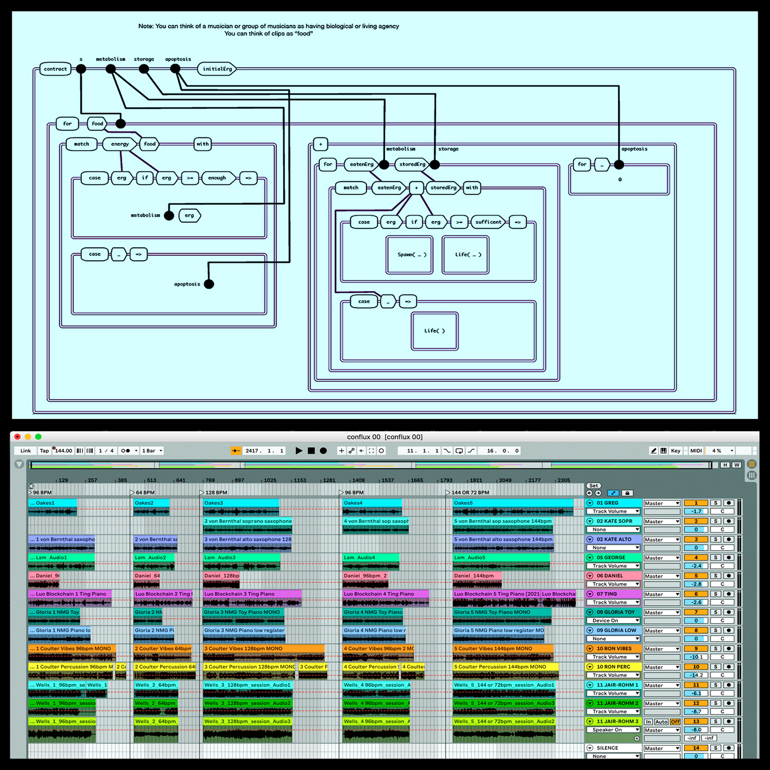 #NMG2021 “cloudy water conflux,” a recorded collaborative composition based on structures found in blockchain. Top row: Patti Kilroy, Kate von Bernthal, George Lam. 2nd row: Gregory Oakes, Gloria Damijan, Ryne Siesky, Ron Coulter. 3rd row: Michael Roth, Lucius Gregory Meredith, Daniel Reyes Llinas, Jair-Rohm Parker Wells. Bottom row: Patrick Grant, Ting Luo, John Ferrari.