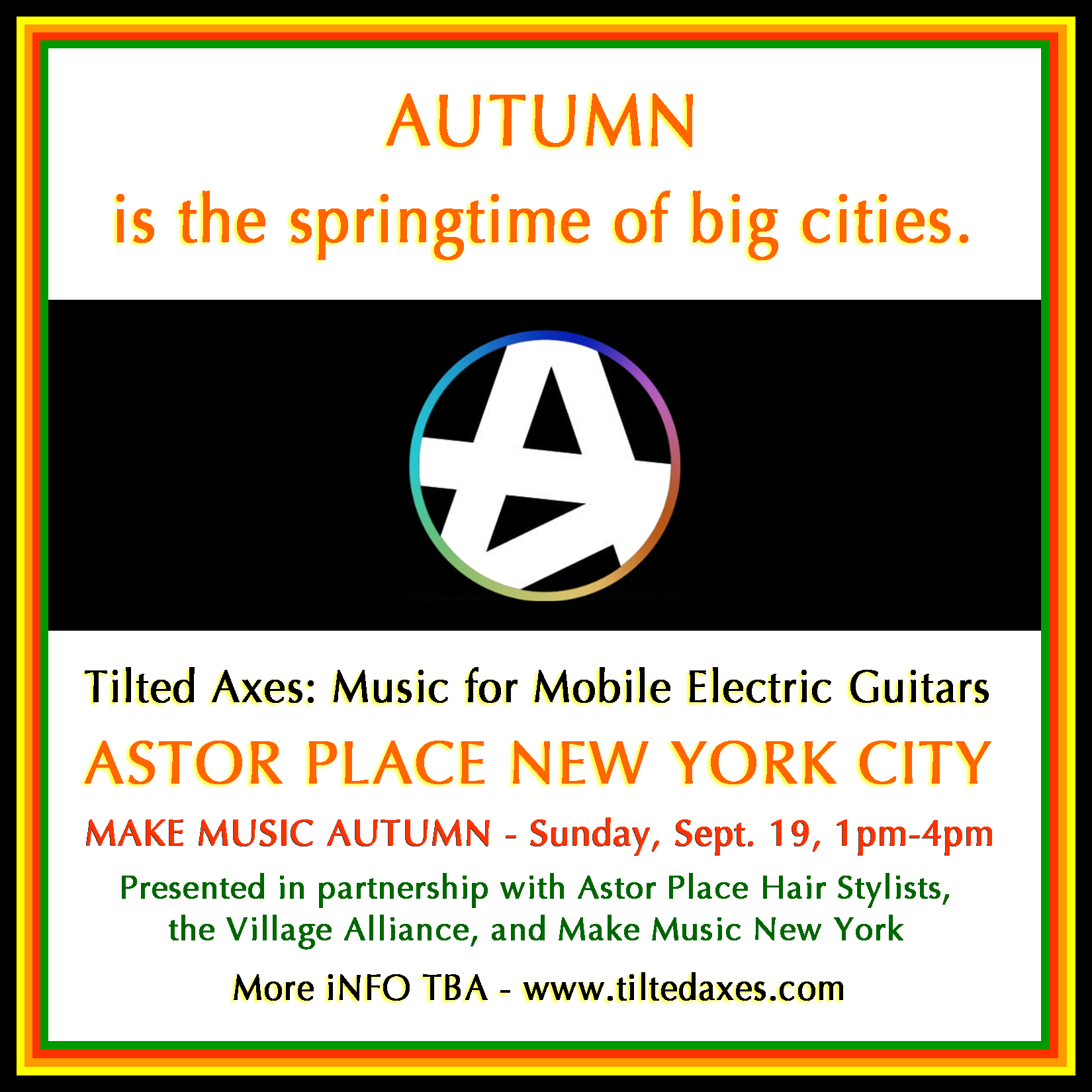 On September 19th, between 1pm-4pm, Tilted Axes: Music for Mobile Electric Guitars returns to Astor Place and environs with a procession and performance as part of the inaugural Make Music Autumn. Tilted Axes is a group of guitarists and percussionists lead by classically trained post-rocker Patrick Grant. They perform original music untethered via mini-amps strapped over their shoulders. For this occassion they have partnered with the iconic Astor Place Hair Stylists who also serve as their base. The performance spectacle will begin at the plaza sculpture The Alamo (a.k.a. The Cube). From there they will perform in-procession around the neighborhoods that have been key to their origin: The East Village and Greenwich Village. They will stop along the way at various landmarks to perform special compositions significant to the location. Bringing the event full circle, they will return to Astor Place Plaza to complete their performance.